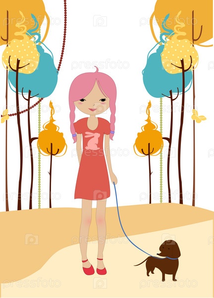 Молодая девочка, прогулки с собакой