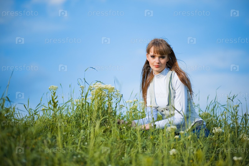 Красивая девушка сидит на поле