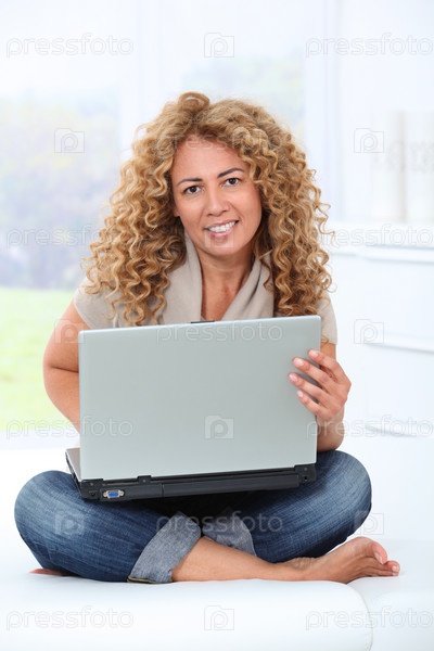 Женщина на дому с использованием портативного компьютера