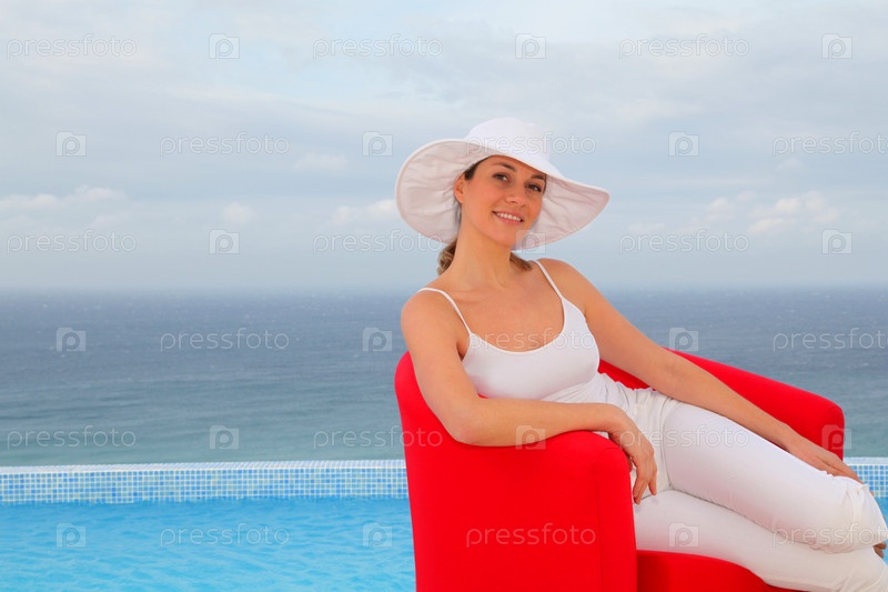 Красивая женщина расслабляющий в красный стул бассейн