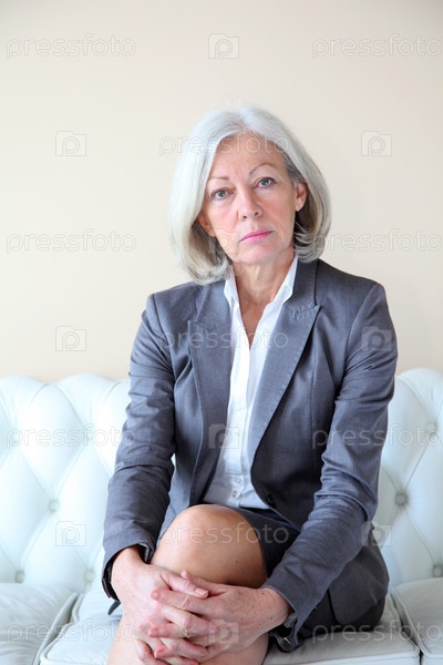 Старший женщина в сером костюме, сидя в Белый диван