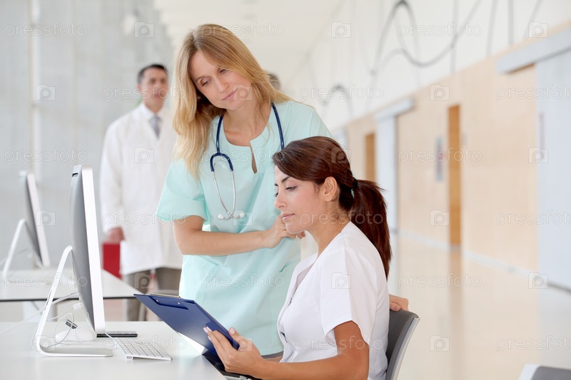 Медсестра с стажер работает перед компьютером