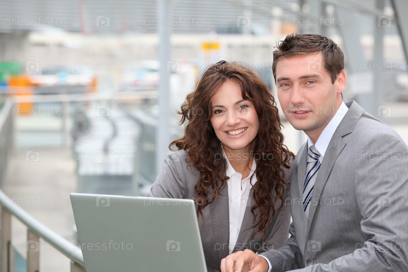 Деловых людей, работающих на портативном компьютере вне