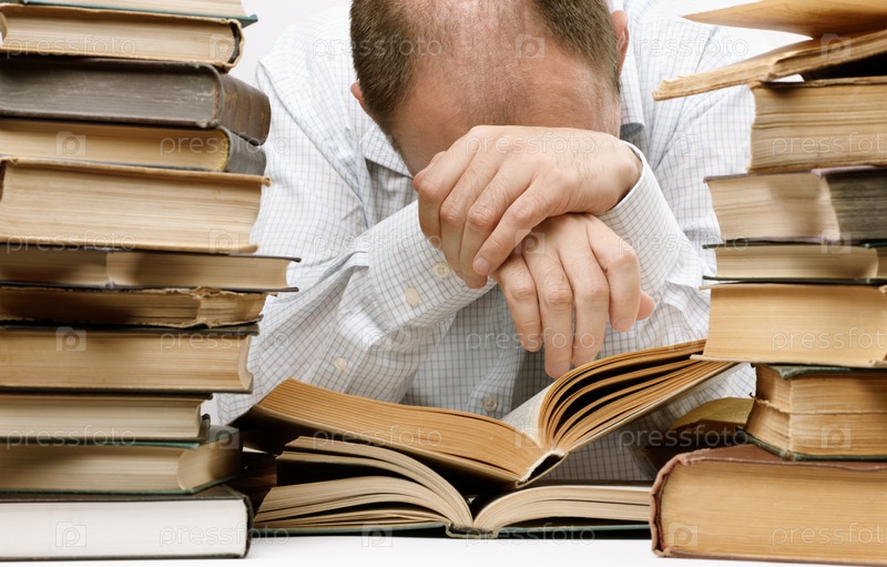 Усталый человек с большим количеством книг, выборочный фокус на части головы