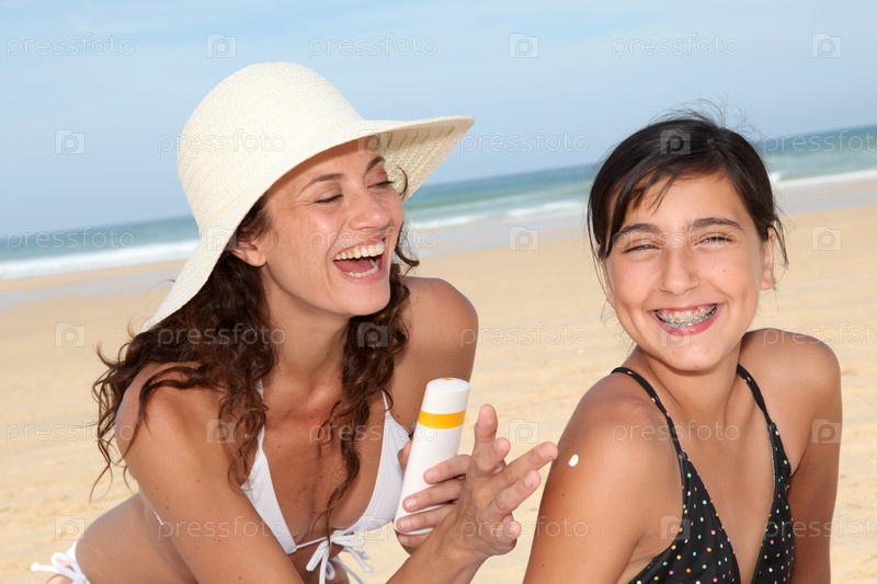 Мать, распространяя солнцезащитный крем на ее плечи дочери