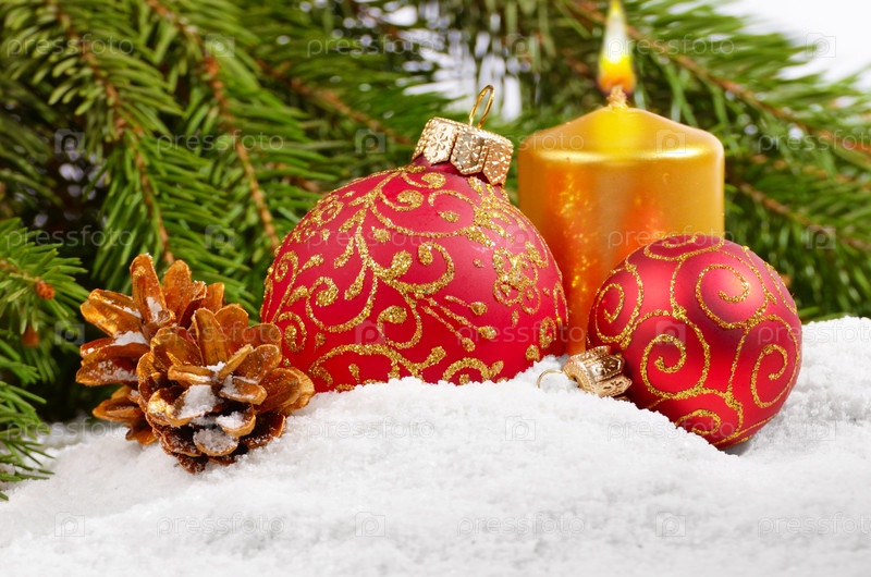 Рождественские шары с золотая свеча над белой