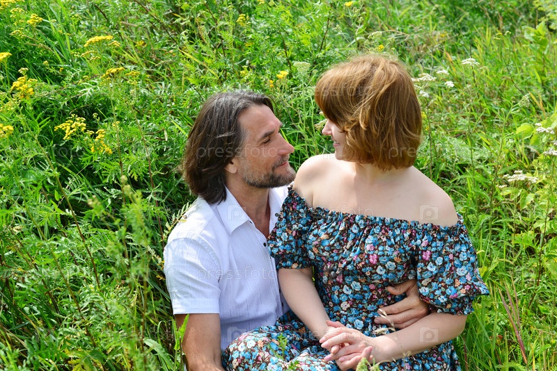 Влюбленная пара, сидя на траве