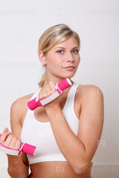 Красивая блондинка женщина, подъем гантели в фитнес зал