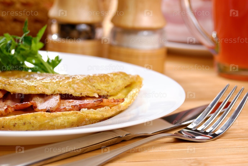 Омлет с беконом, подается на белом фоне