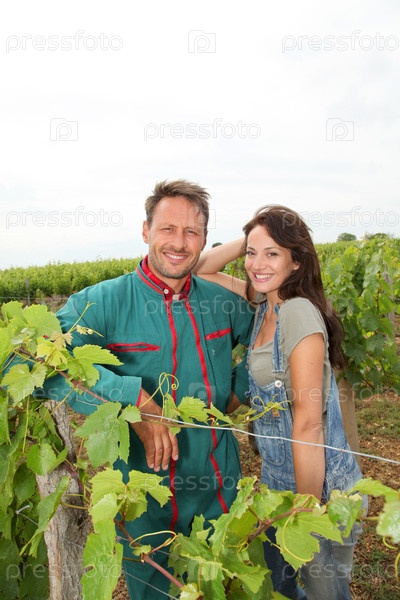 Счастливая пара виноделов в винограднике