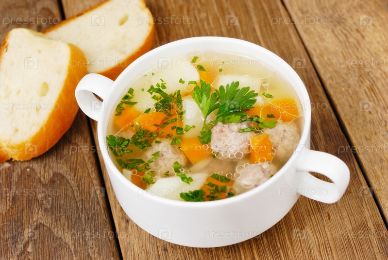 Домашний суп с фрикадельками на деревянный стол