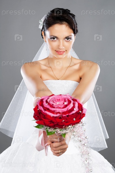 Невеста с красным букетом на сером фоне