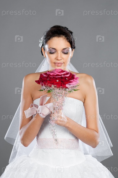 Невеста с красным букетом на сером фоне