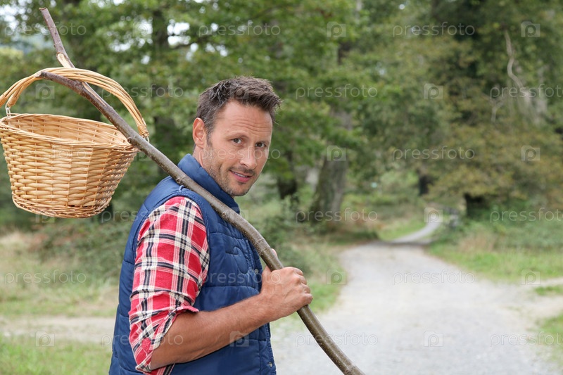Человек с корзинкой за грибами на земле