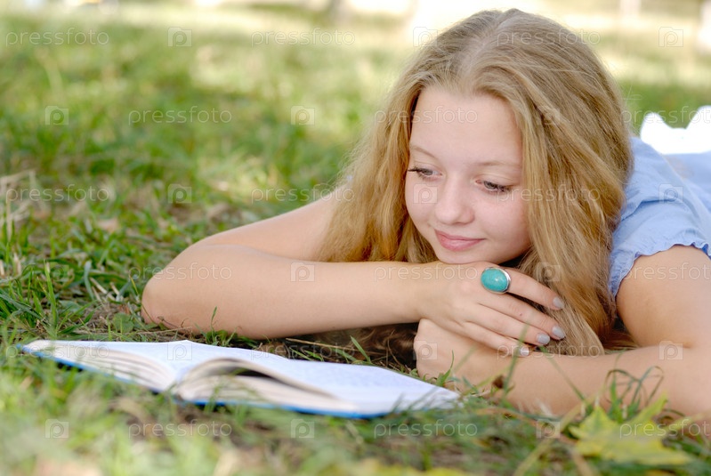 Красивый длинноволосый блондинка отдыхает с книгой на открытом воздухе