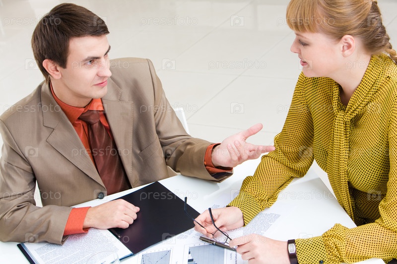 Деловая женщина и бизнесмен обсуждают план на встрече