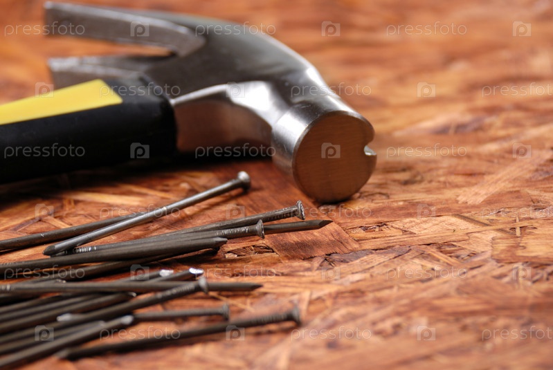 Молоток и гвозди на фоне ДВП
