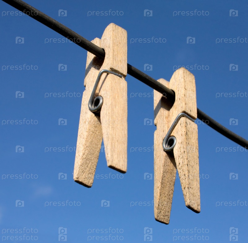 Два деревянных крючка для одежды вешают веревку на фоне неба