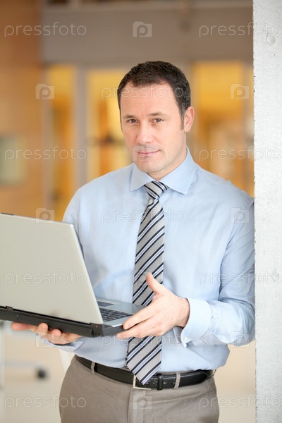 Бизнесмен, стоя в зале с портативного компьютера