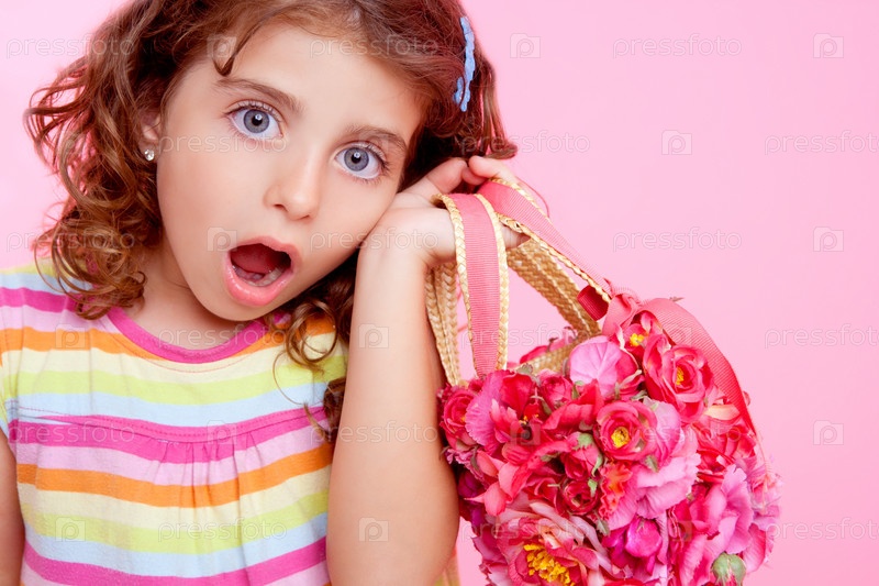 Дети Маленькая девочка держит поддолье весны розовые цветы мешок с рупированным выражением