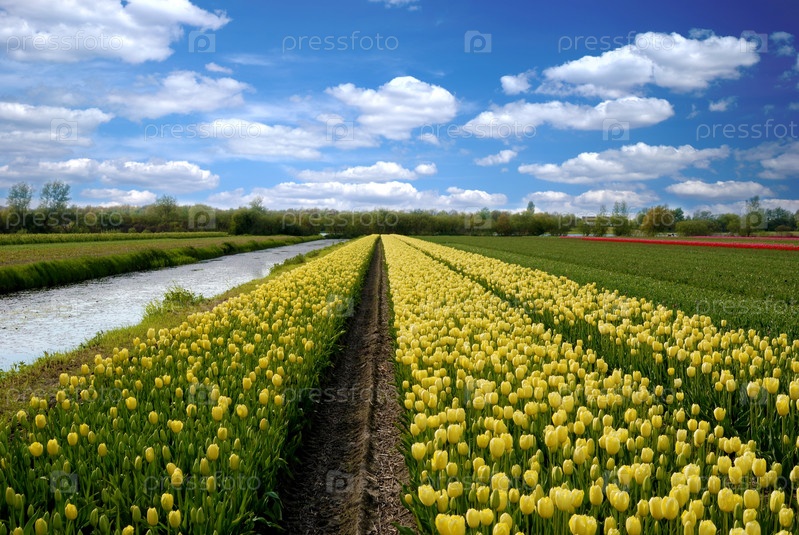 Поле тюльпанов под голубым небом облачно, Нидерланды