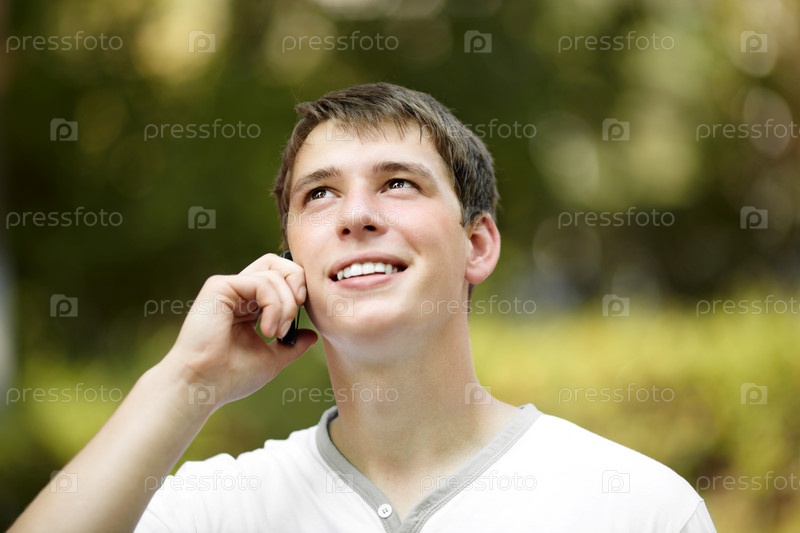 Портрет молодого человека с сотового телефона, окружающего света и серебряные отражения