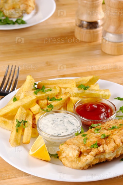 Жареная рыба и чипсы на белом фоне