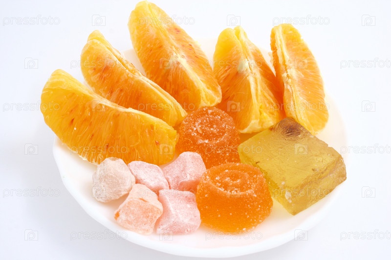 Апельсиновые дольки и мармелад на блюдце, белый фон