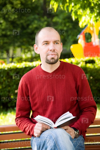 Человек в парке с книгой, фокус точки на лице (селективная)