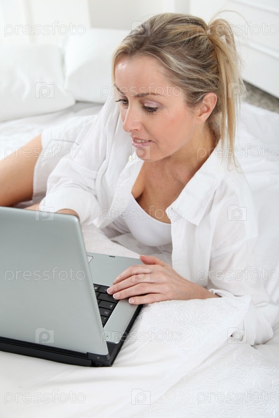 Блондинка женщина с портативного компьютера на кровати