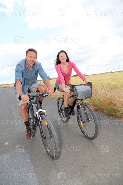 Велосипед езда пара на проселочной дороге