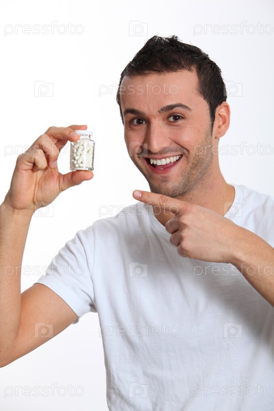 Крупным планом улыбающийся человек, держащий бутылку таблетки