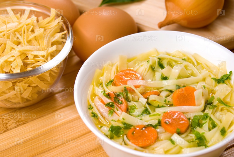 Суп-лапша с морковь на деревянный стол