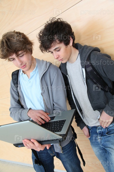 Группа подростков мальчиков в школе с портативного компьютера