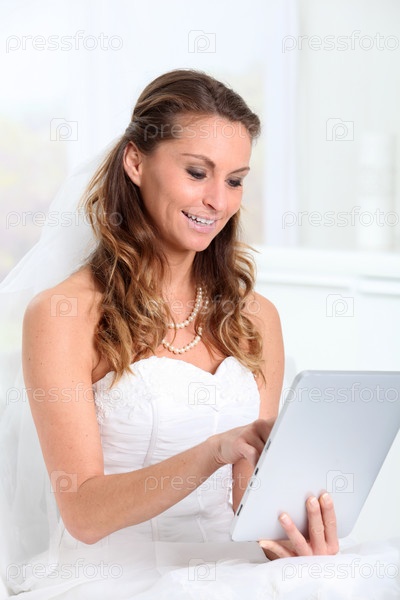 Красивая невеста серфирует по электронным планшетам