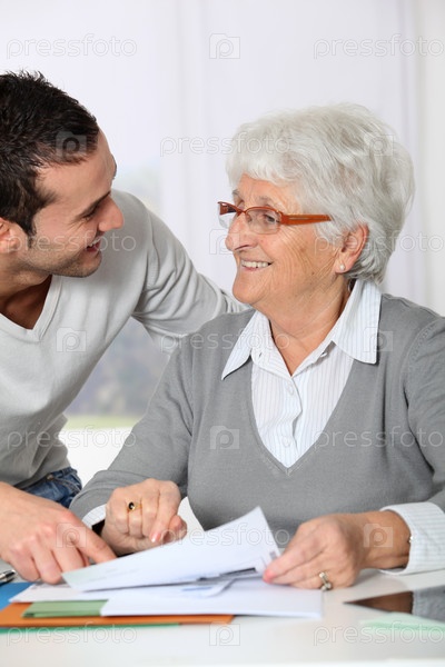 Молодой человек, помогая пожилой женщины с документами