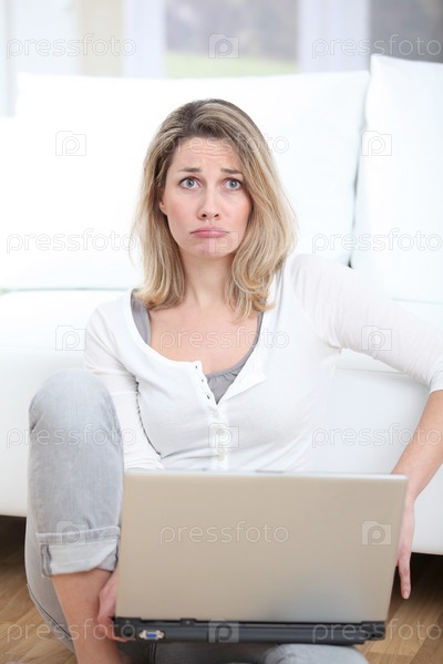 Женщина с расстроен взгляд, используя портативный компьютер