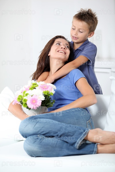Маленький мальчик, давая цветы к его маме на день матери