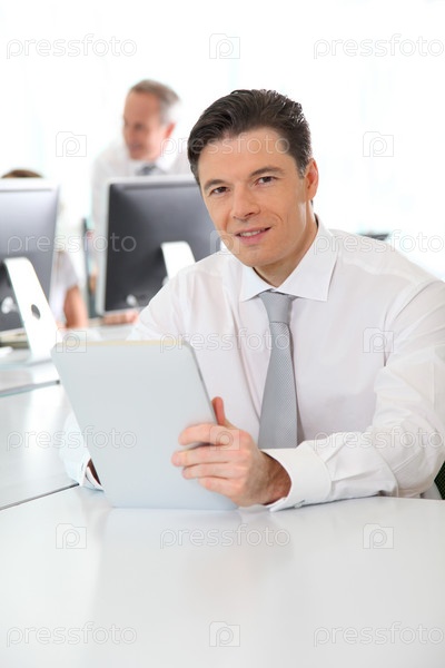 Офисный работник, используя электронный планшет в офисе