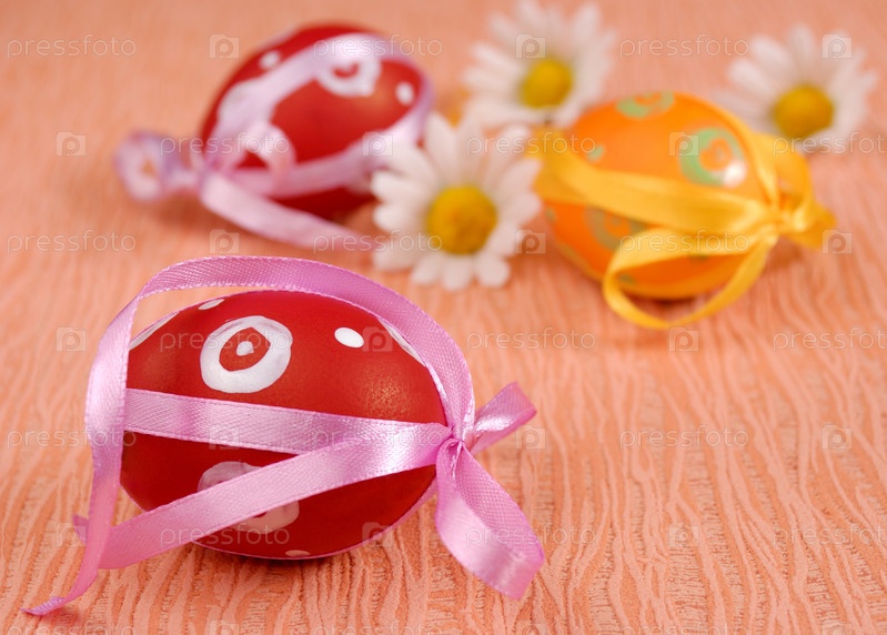 Пасхальные яйца с бантиками на оранжевом фоне