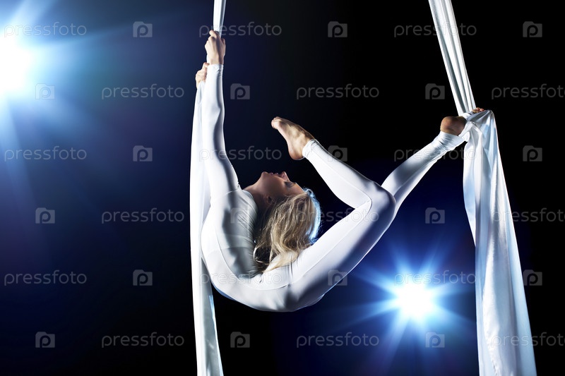 Молодая женщина гимнастка. На черном фоне с флеш-эффект