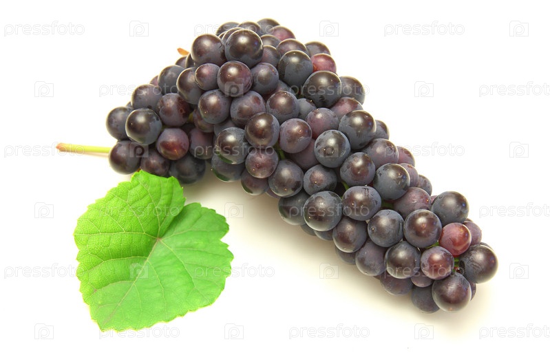 Гроздь черного винограда с зеленым листом на белом фоне