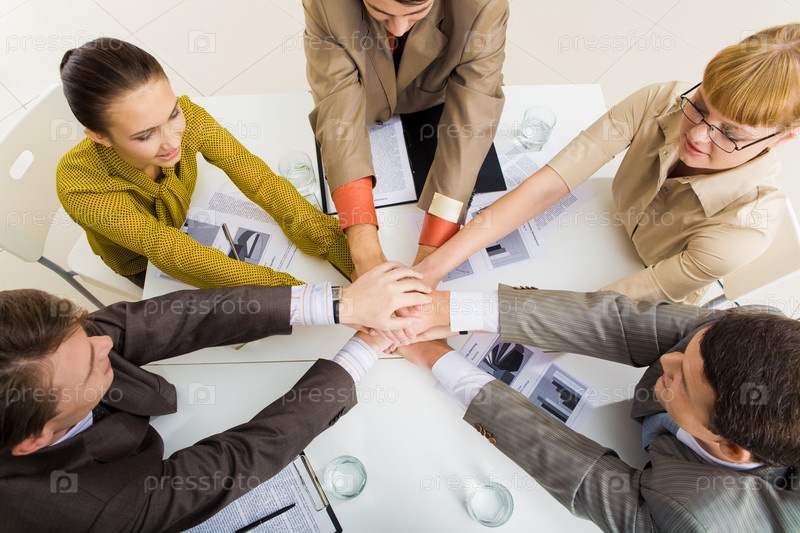 Вид сверху на деловых партнеров, делающих кучу рук, сидя за столом