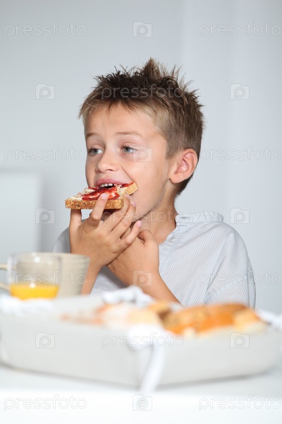 Мало блондинка мальчик ест кусок хлеба