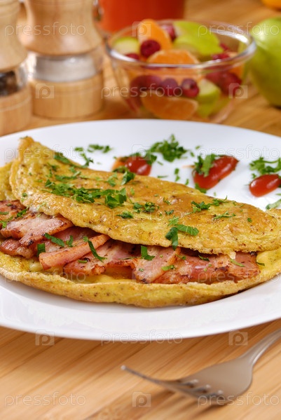 Омлет с беконом, подается на белом фоне