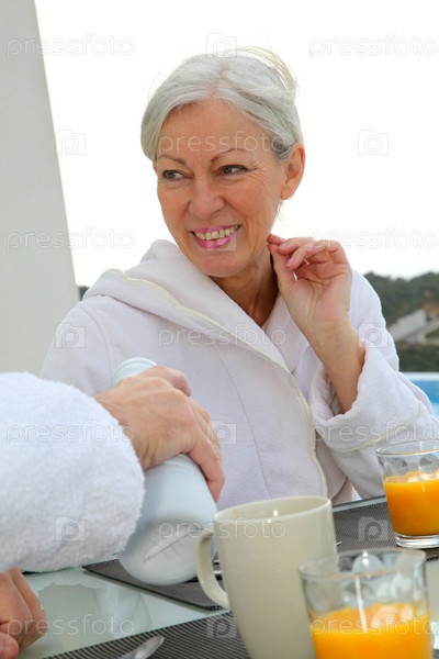 Пожилые супружеские пары, имеющие завтрак снаружи