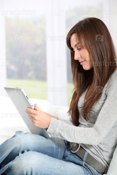 Молодая женщина, сидя на диване
