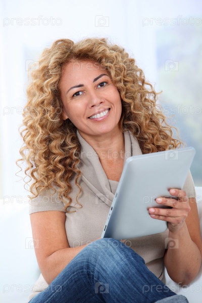 Женщина в диван, используя электронный блокнот