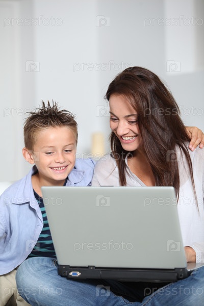 Маленький мальчик и мать, сидя на диване у себя дома с ноутбуком