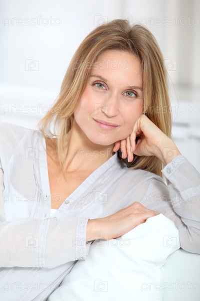 Крупным планом красивая блондинка женщина, отдыхаете дома